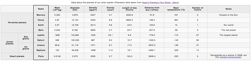 Los siguientes pasos describen lo que necesitas para completar el ejemplo de la tabla. Todos los datos que necesitarás están en el archivo planets-data.txt. Si tienes problemas para visualizar los datos, mira el ejemplo de arriba o intentalo dibujando un diagrama.